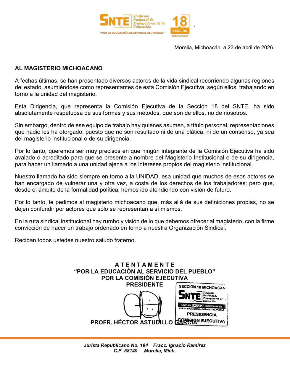 Esta Dirigencia, que representa la Comisión Ejecutiva de la Sección 18 del SNTE, ha sido absolutamente respetuosa de sus formas y sus métodos, que son de ellos, no de nosotros.