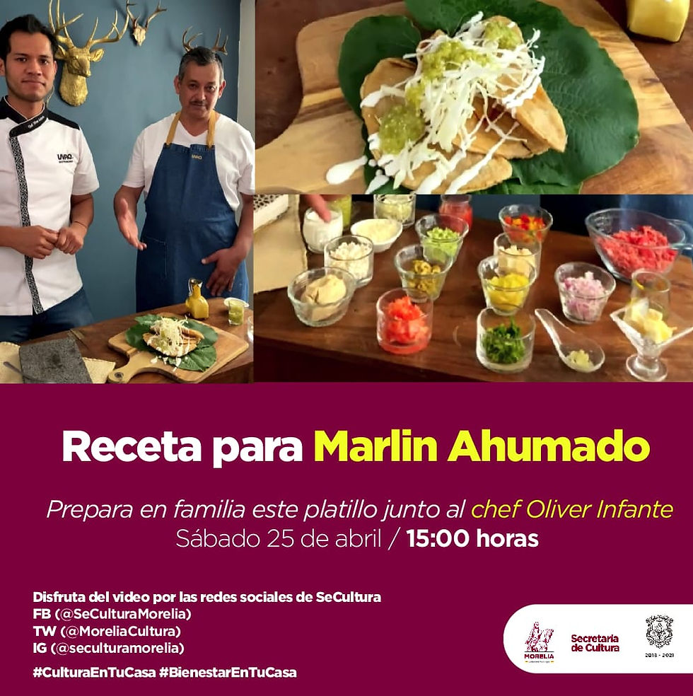 El programa #CulturaEnTuCasa del Gobierno de Morelia desarrollado a través de la Secretaría de Cultura Municipal, acompaña en este tiempo de #SanaDistancia a las familias, y a través de las cápsulas creativas, entrega opciones para compartir tiempo de calidad con los seres queridos, fomentando la sana convivencia, el amor y la tolerancia entre los miembros del hogar, recordó Cardiela Amézcua Luna, encargada de la política cultural en el Municipio. Con 32 años de edad, el licenciado en Artes Culinarias recordó su primer acercamiento a la gastronomía fue con sus abuelos en La Huacana, queseros de antaño que lo criaron en el artesanal oficio, tiempo que le sirvió para estar cerca de sus familiares y reforzar lazos de amor y entendimiento entre generaciones, por eso invita a compartir tiempo en la cocina y el conocimiento cultural que existe a través de los alimentos. “Aprender a cocinar es importante para sobrevivir, preservar y cuidar de las recetas y las tradiciones en casa, además de que es terapéutico para distraer la mente y disfrutamos de los sentidos. Si en esta receta participan menores de edad, hay que evitar que ellos traigan algún cuchillo en la mano o corten los ingredientes, esto lo deberán hacer los adultos”, explicó el chef. Los ingredientes que se necesitarán para la elaboración del platillo, son: 1/4 de marlin ahumado, 1 pieza de chile morron verde, 1 pieza de chile morron rojo, 2 piezas de chile güero o de agua, 2 piezas de jitomate, 1 rama de apio, 3 dientes de ajo, 1/2 taza de aceitunas en rodajas, 100 mililitros de puré de jitomate, 1 pieza de cebolla, 1 ramito de perejil. Y para las quesadillas se requerirá: 1/2 kilo de masa o tortillas ya hechas de masa o harina, queso oaxaca, queso ranchero, repollo, sal a gusto, crema y salsa de tomate. En el currículum de Infante Lara, talento moreliano y maestro de gastronomía en la Universidad Vasco de Quiroga, se puede leer su participación y primer lugar en el IV Concurso Internacional de Tapas y Pinchos en Valladolid, España, concurso en el que compitió con profesionales de Bélgica, Estados Unidos, Canadá e Italia, entre otros países. Si deseas ver las cápsulas creativas que comparte el Gobierno cercano a la gente de Raúl Morón Orozco, y que se suben de lunes a viernes a las 11:00 y 18:00 horas, y los sábados en distintos horarios, puedes encontrarlas en: Facebook (@SeCulturaMorelia), Twitter (@MoreliaCultura) e Instagram (@seculturamorelia).
