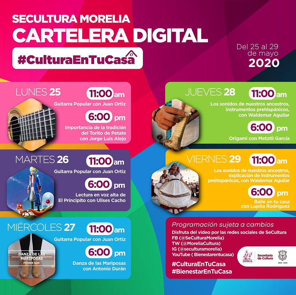 • Del 25 al 29 de mayo, en las redes sociales de la SeCultura Morelia, tienes una amplia actividad cultural de forma digital