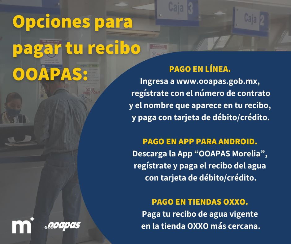 PAGO EN APP OOAPAS. Está disponible la aplicación “OOAPAS Morelia” para descargar en cualquier dispositivo móvil con sistema Android, a través de la cual se podrá pagar el recibo del agua con tarjeta de débito o crédito.