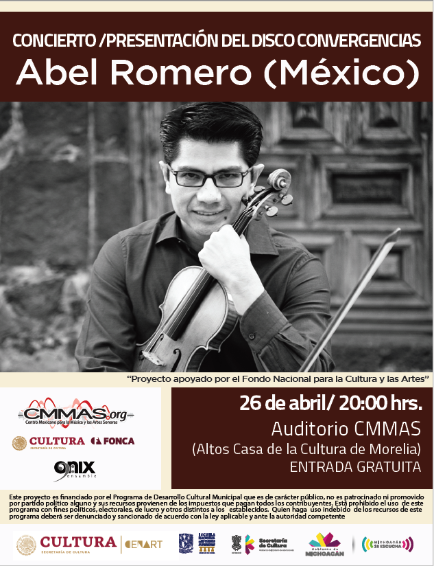 Morelia, Mich., a 24 de marzo 2019.- El Centro Mexicano para la Música y las Artes Sonoras (CMMAS), presenta el concierto - presentación del disco “Convergencias”, del destacado violinista mexicano Abel Romero. La cita es este viernes 26 de abril en punto de las 8 de la noche, en las instalaciones del auditorio del Centro.